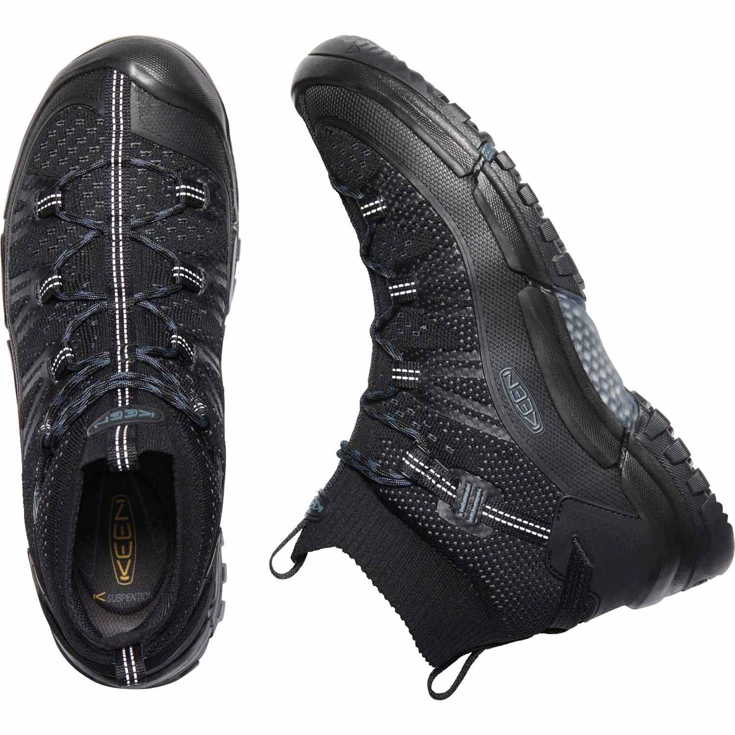 Cholewka Axis EVO wykorzystuje opatentowaną technologię EVOFIT, czyli dzianiny poliestrowej, która zapewnia świetne dopasowanie i wysoką oddychalność. Dzięki agresywnemu bieżnikowi podeszwy i niskiej wadze, która zapewnia lepszą szybkość i zwiększoną sprawność, Axis EVO pozwoli wspinać się w każdym krajobrazie. Podeszwa środkowa EVA zapewnia amortyzację i wsparcie. But wyposażony jest w element stabilizujący, który zapewnia odpowiednią na podejściach sztywność. Podeszwa zewnętrzna KEEN.All-Terrain z 4mm wypustkami daje wysoką przyczepność na zróżnicowanych powierzchniach. Materiałowy kołnierz w cholewce na kształt skarpety jest elastyczny. Dzięki niemu w trakcie górskich eskapad nie będziesz musiał pozbywać się z butów przypadkowych kamieni. Elastyczne sznurowane umożliwia idealne i bezpieczne dopasowanie. Wnętrze pokryte jest powłoką Cleansport NXT w celu zwalczania drobnoustrojów powodujących nieprzyjemne zapachy i utrzymania stopy w świeżości.